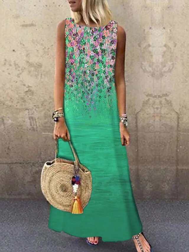 Green Blue Light Green Sleeveless Floral Print Spring Summer Round Neck Elegant Casual.