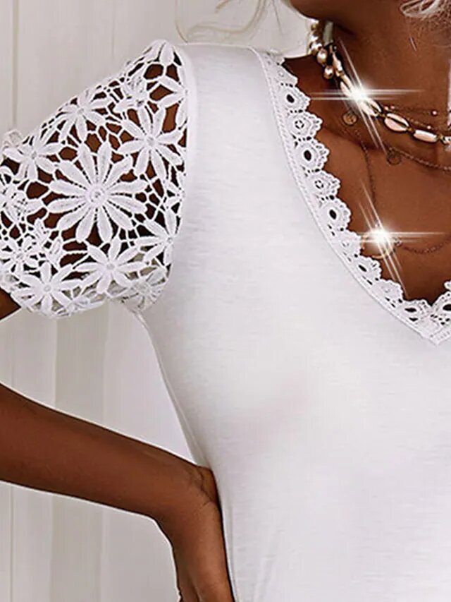 White Short Sleeve Pure Color Cut Out Lace Spring Summer V Neck Sexy Mature.