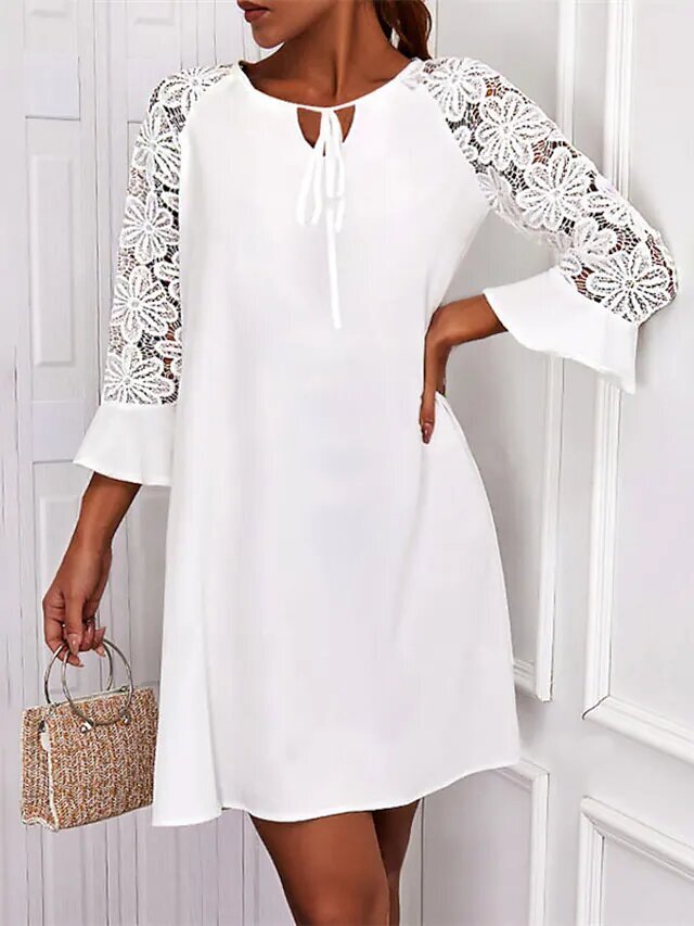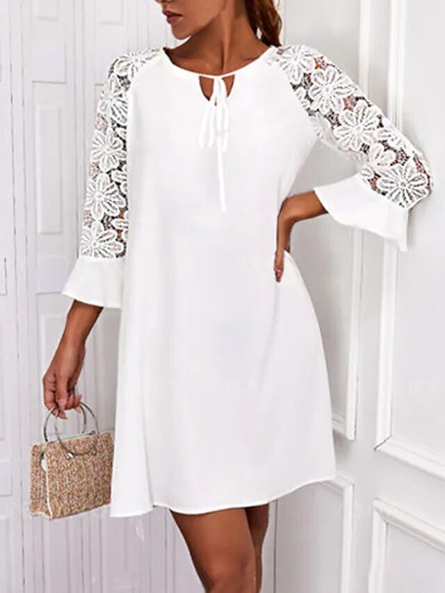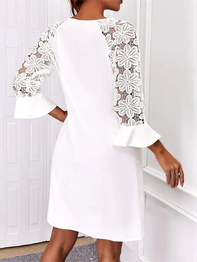 White 3/4 Length Sleeve Floral Ruffle Lace Spring Summer Crew Neck Stylish Sexy Mature.
