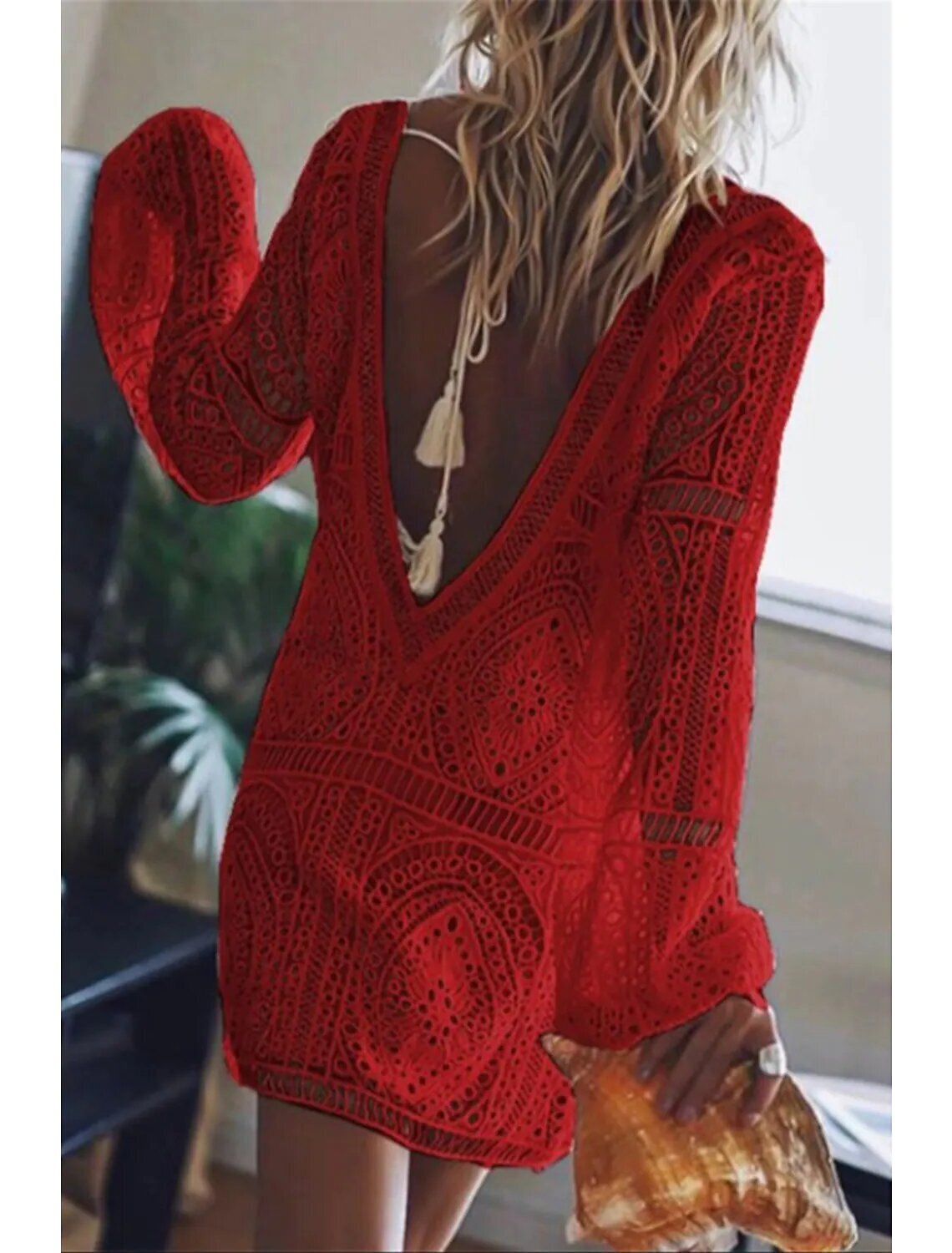 Long Sleeve Solid Color Backless Hollow Out Lace Fall Spring Deep V Hot Casual Sexy 2022.