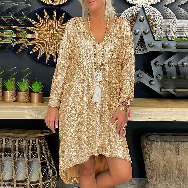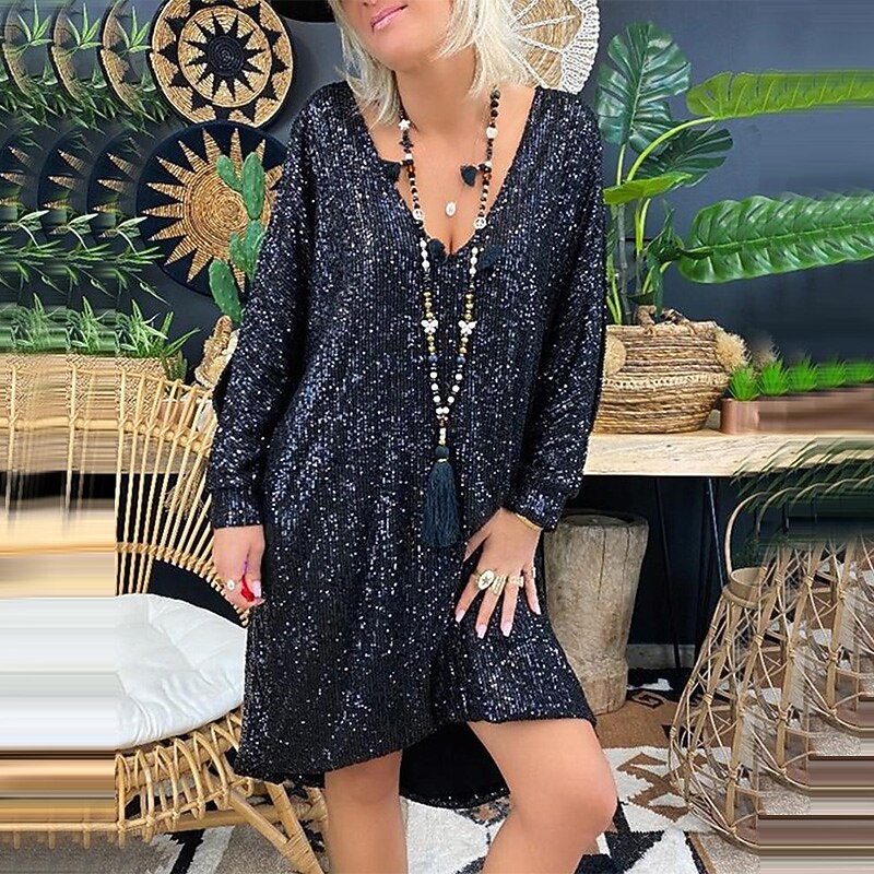 Sleeve Pure Color Sequins Fall Spring V Neck Fashion Party Loose 2022