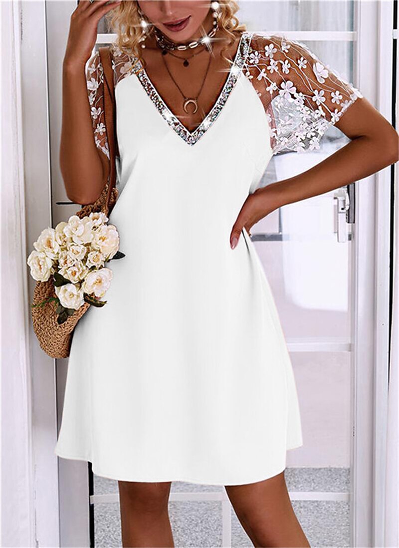 Sleeve Pure Color Sequins Lace Spring Summer V Neck Stylish Casual Modern