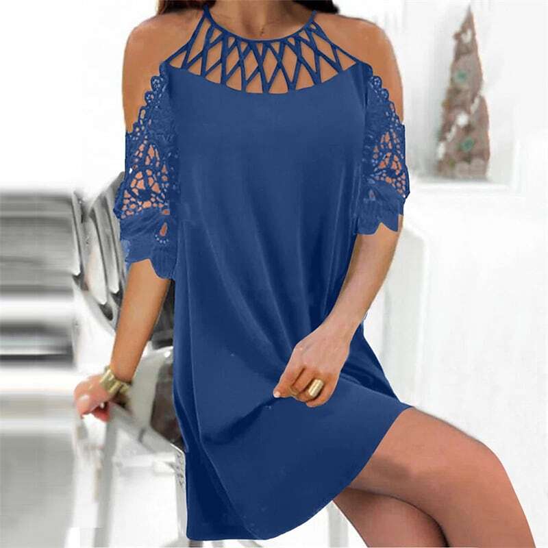 Color Hollow Out Patchwork Cold Shoulder Spring Summer Round Neck Casual.