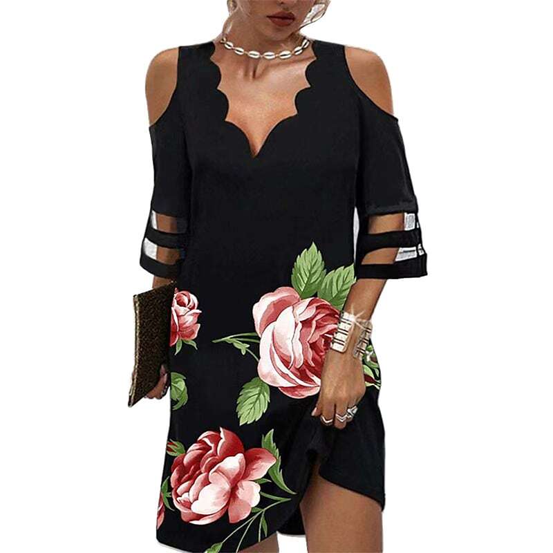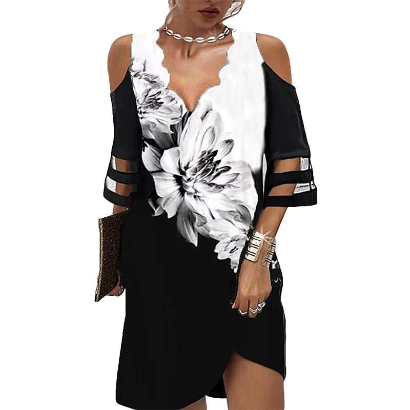 Dress White Black Pink Short Sleeve Floral Color Block Mesh Cold Shoulder Print Spring Summer V Neck Work Casual Vintage.