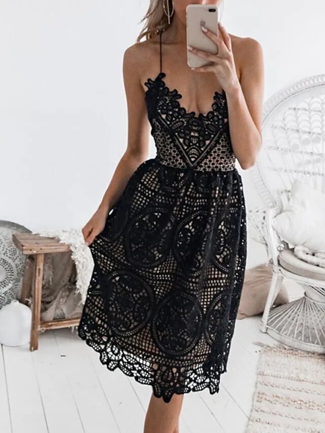White Black Sleeveless Solid Color Backless LaceFall Summer V Neck Casual Sexy Party.