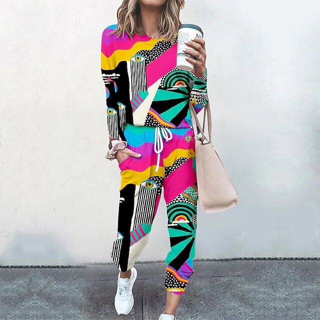 Patterned Abstract Going out Casual Daily Two Piece Set Crew Neck Sweatshirt Tracksuit Pants Sets Pant Loungewear Jogger Pants Drawstring.