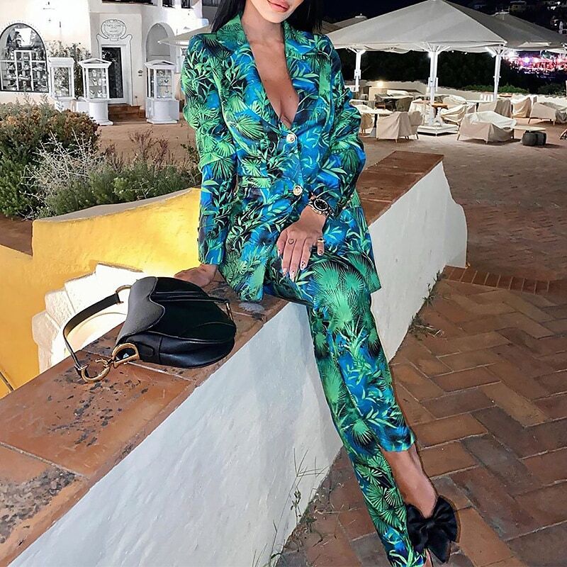 Suits Blazer Outdoor Street Daily Fall Regular Coat Regular Fit Breathable Jacket Long Sleeve Print Green Blue.