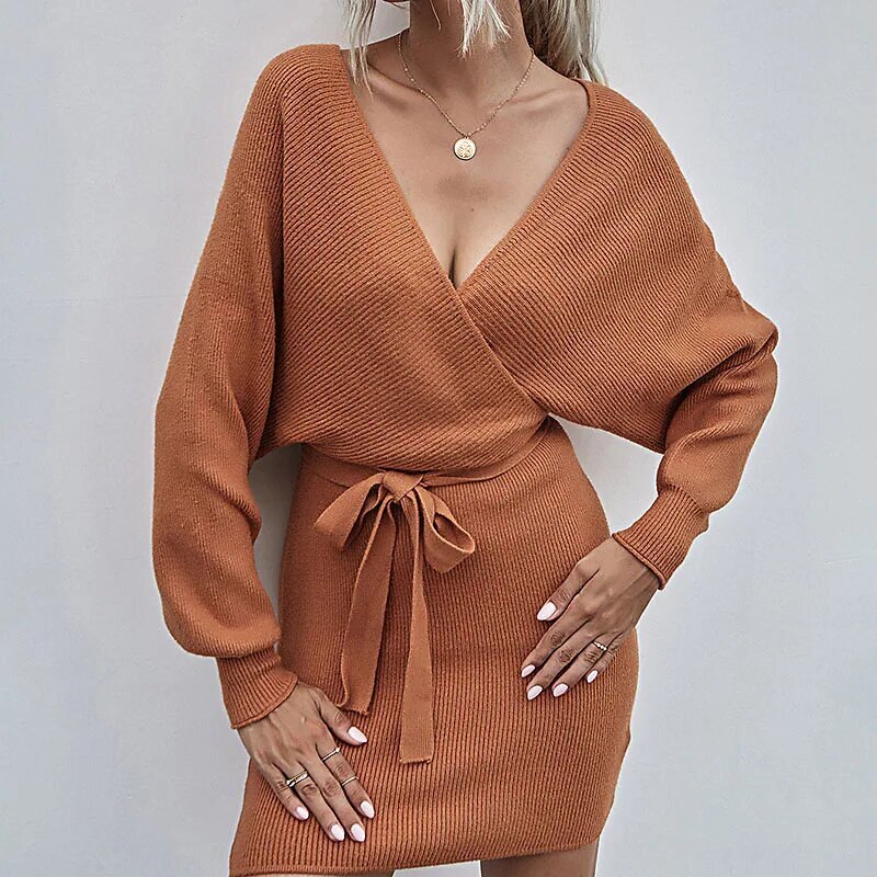 Mini Dress Green Black Gray Khaki Red Brown Long Sleeve Solid Color Lace up Fall V Neck Casual.