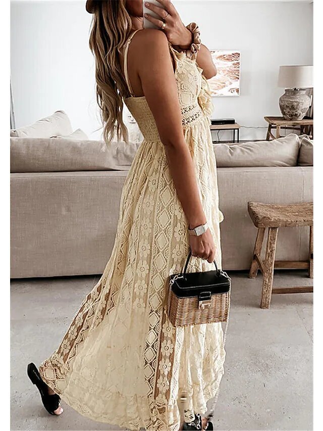 White Beige Sleeveless Print Embroidered Lace Spring Summer V Neck Casual Boho.