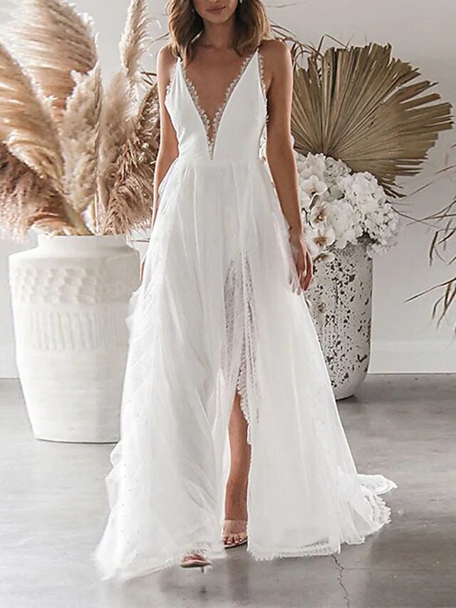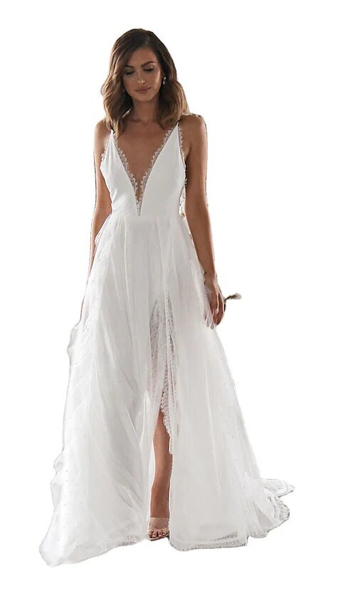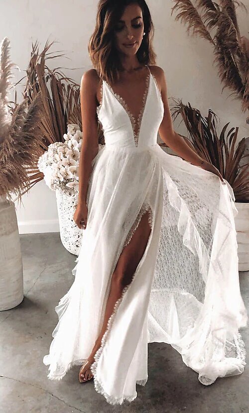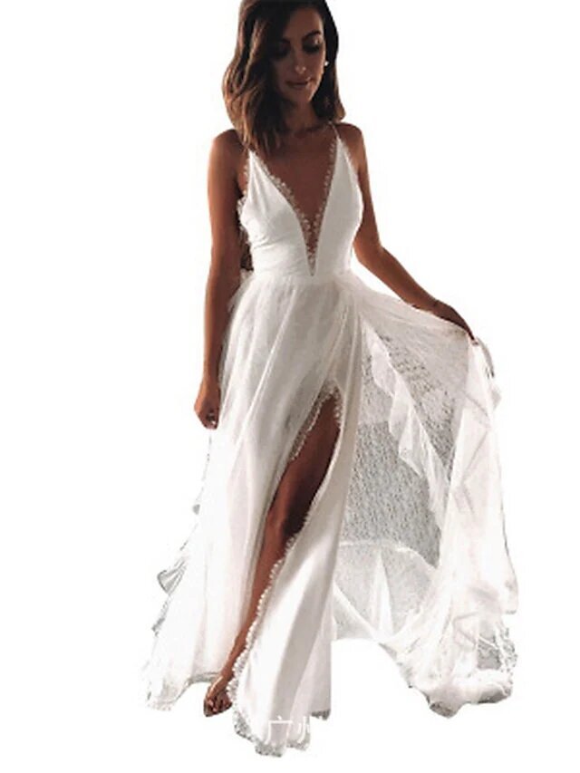 White Sleeveless Solid Color Split Lace Spring Summer Deep V Elegant Romantic Sexy Party Prom Dress.