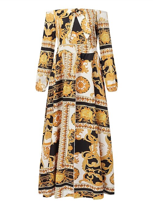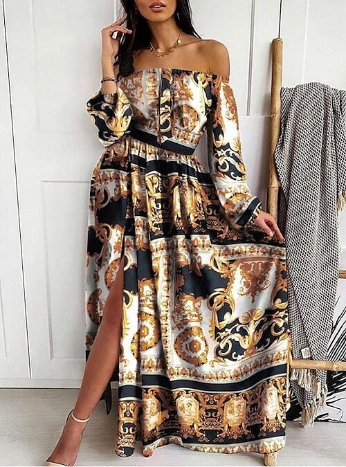 Dress Maxi long Dress Pink Khaki Long Sleeve Print Split Print Summer Off Shoulder Hot Sexy Party.