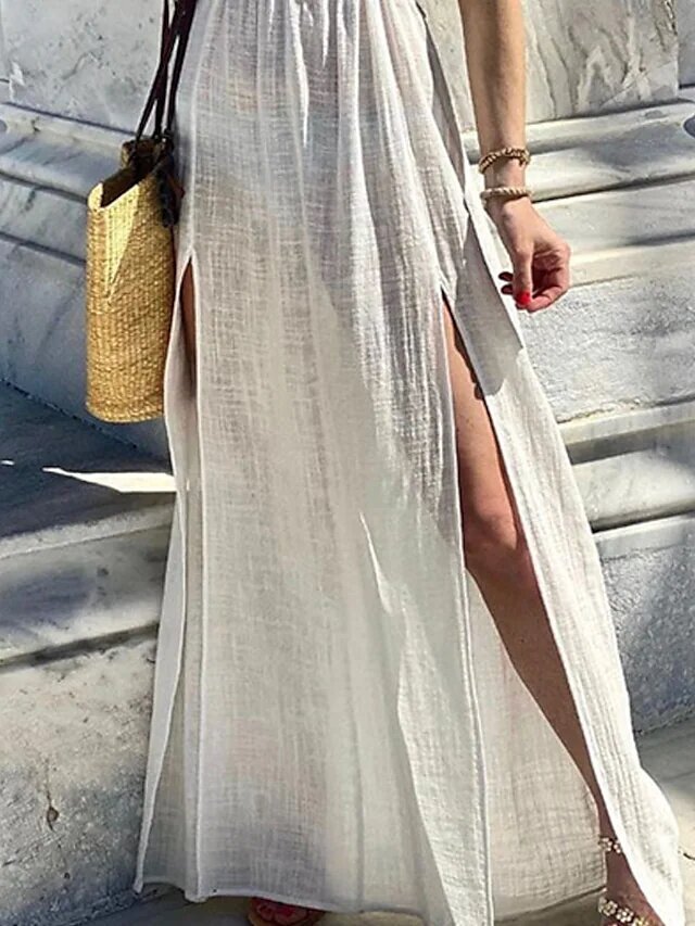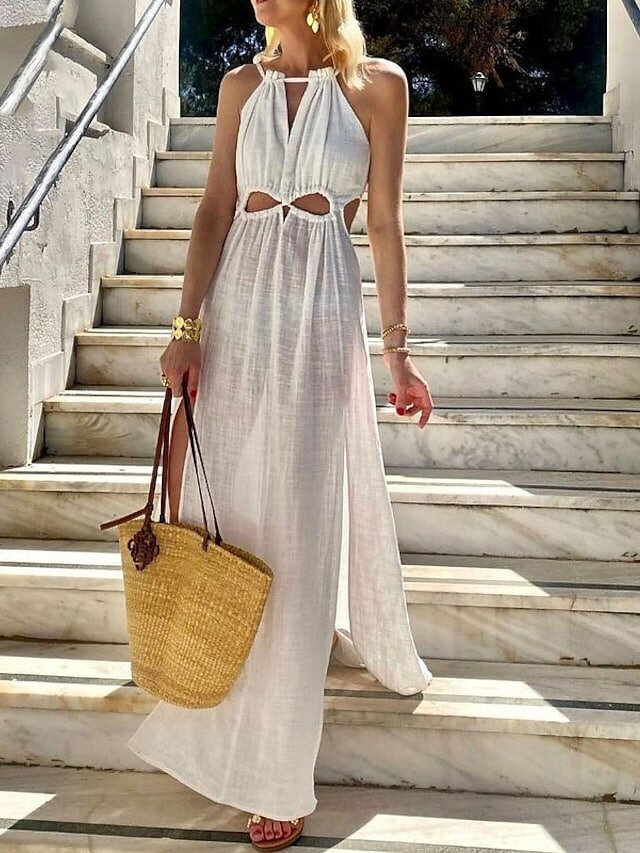 White Sleeveless Pure Color Backless Split Hollow Out Spring Summer Halter Neck Vacation Modern.