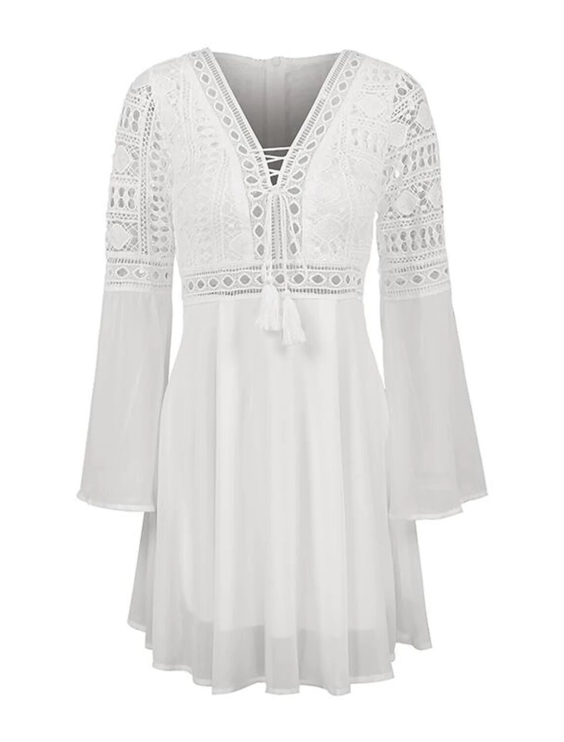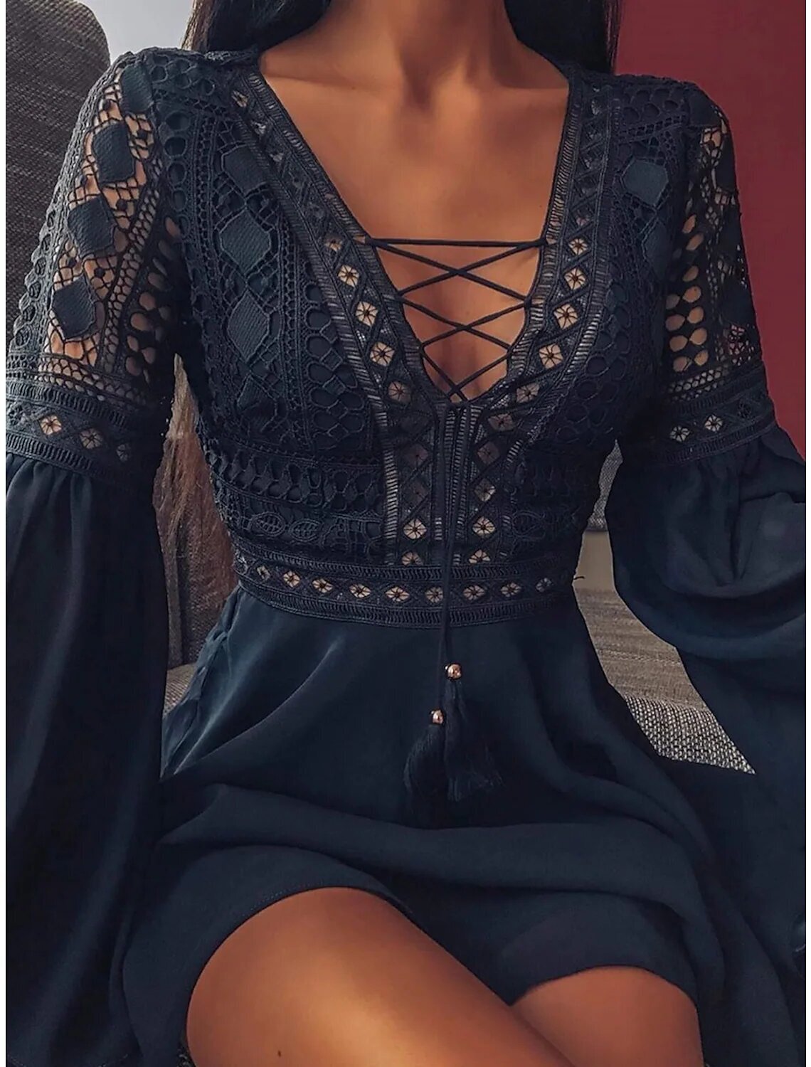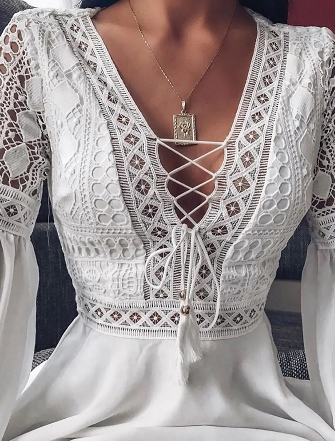 Sleeve Pure Color Hollow Out Mesh Patchwork Spring Summer V Neck Hot Sexy Slim 2022