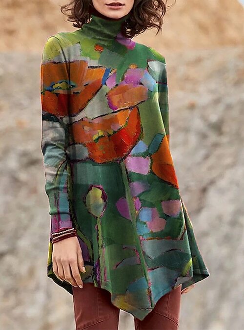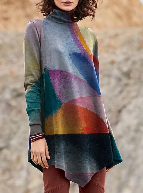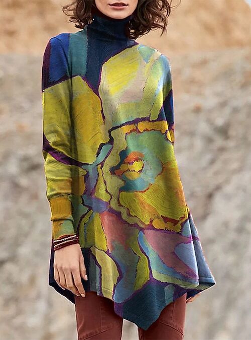 Dress Tee Dress Short Mini Dress Green Blue Purple Yellow Long Sleeve Print Patchwork Print Fall Winter Turtleneck Casual Loose