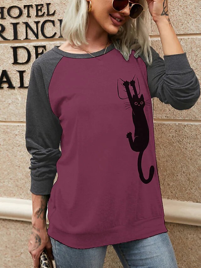 Cat Painting T shirt Tee Long Sleeve Print Round Neck Basic Essential Green White Red.