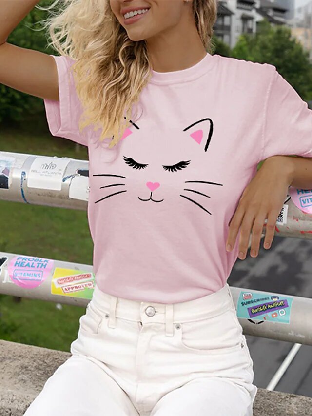 Cat Painting T shirt Tee Short Sleeve Print Round Neck Basic Essential White Pink Yellow.