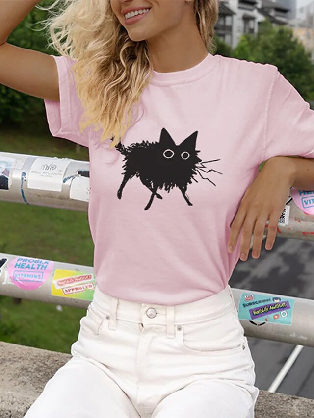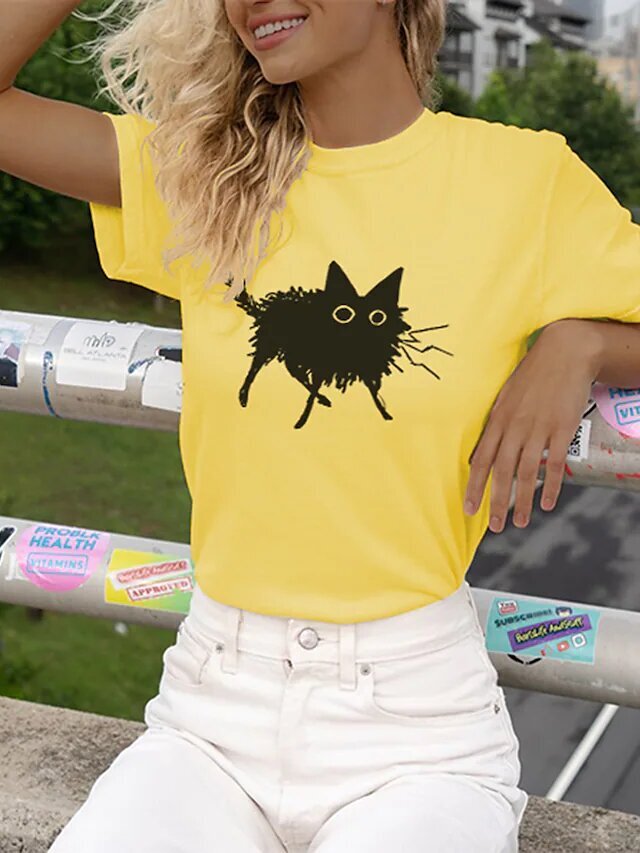 Cat Painting T shirt Tee Short Sleeve Print Round Neck Basic Essential White Pink Yellow.