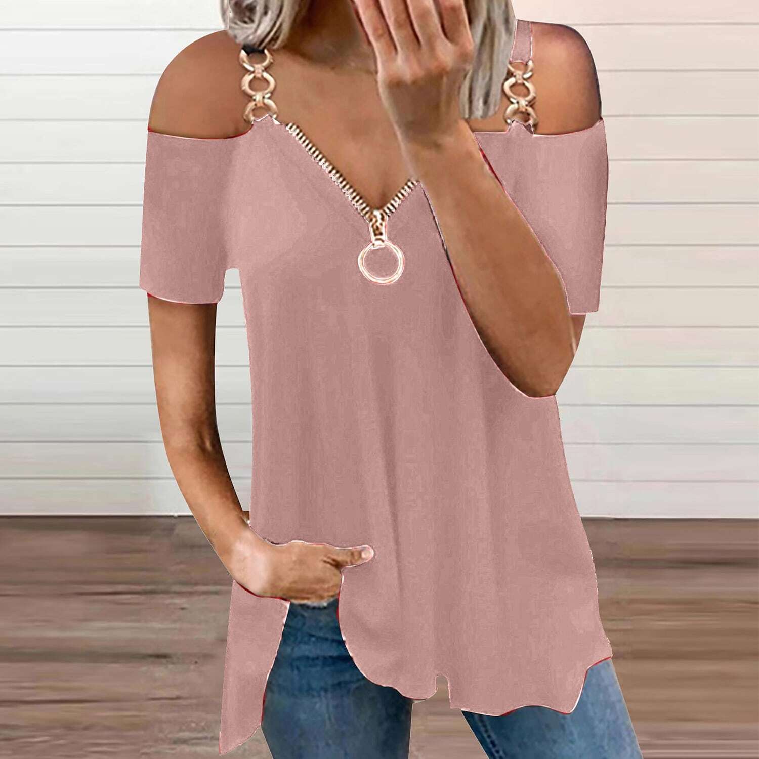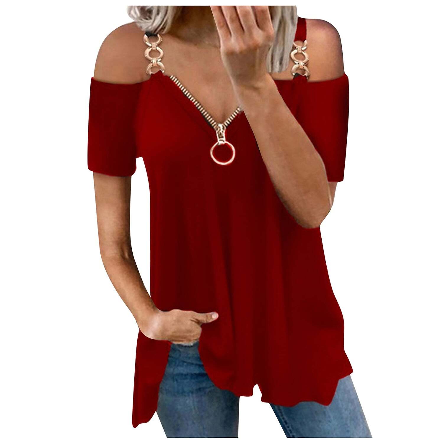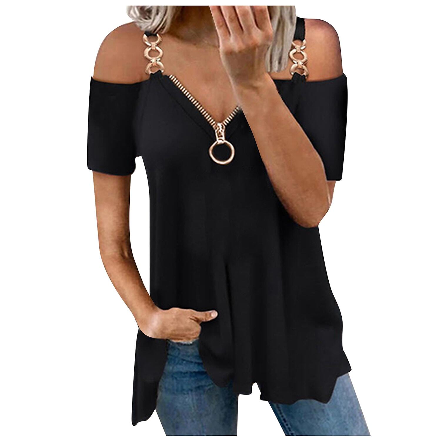 T shirt Tee Plain Casual Weekend T shirt Tee Short Sleeve Cold Shoulder Quarter Zip V Neck Basic Essential White Black Pink S.