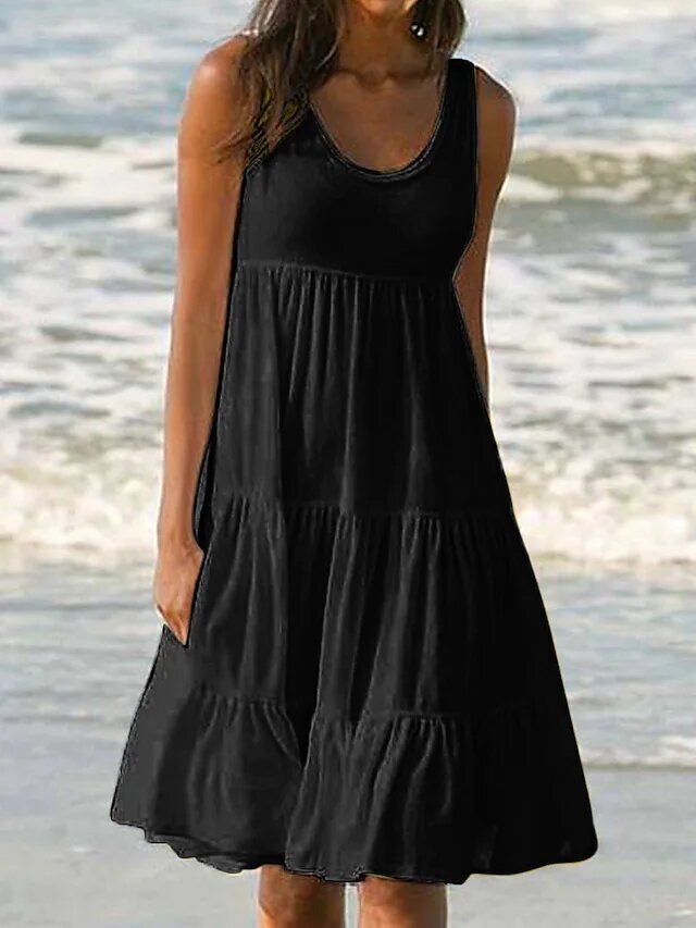 Green White Black Blue Pink Yellow Fuchsia Sleeveless Solid Color Ruched Pleated Spring Summer Round Neck Basic Hot Casual Boom Sale Dress.
