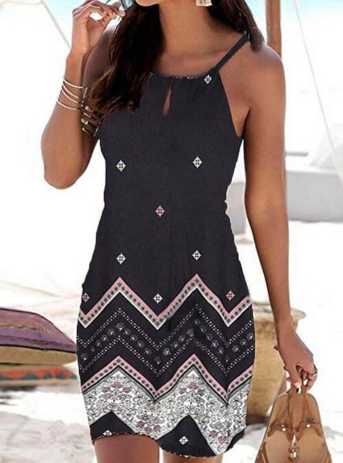 Dress Short Mini Dress White Black Blue Sleeveless Geometric Print Summer Round Neck Casual Boho.