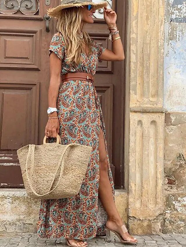 Red Brown Short Sleeve Floral Print Split Ruffle Print Spring Summer V Neck Vacation Vintage Boho.